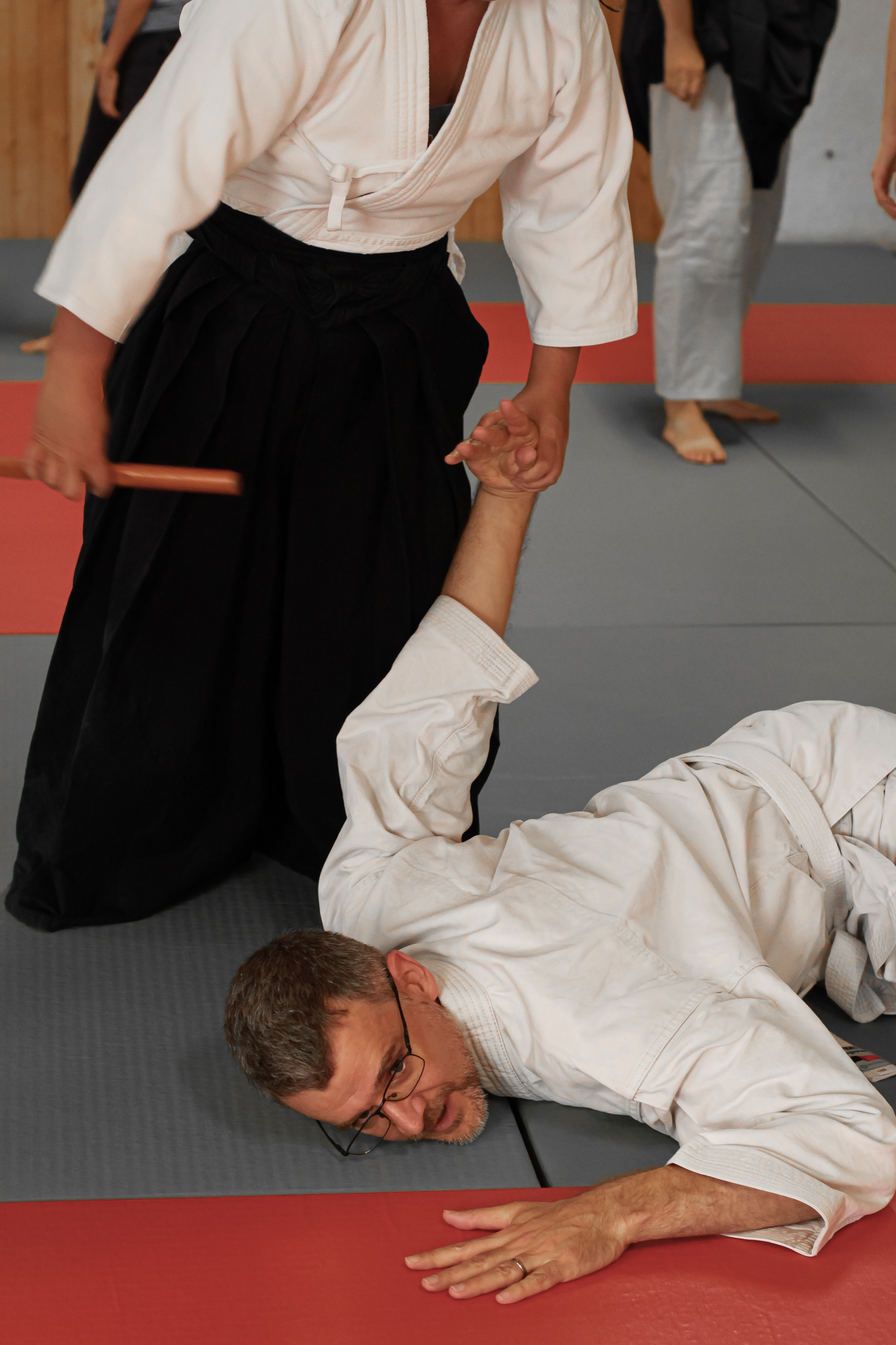 Les visiteurs de Cannes, Nice, Tours, Cahors, Lyon, Bourg-en-Bresse, et même Groningen (Pays Bas), ont pu expérimenter le thème RI-AI, tant par une approche calligraphique, que philosophique, mais aussi et surtout : martiale. En effet, des exercices mettant en avant tous les principes sous-jacents avaient été imaginés par nos deux sensei, afin d'arpenter toutes les facettes de ce principe fondamental. Après ces exercices "sur mesure", les participants ont pu mettre en pratique l'enseignement dans leur travail des kata, avec pour certains, le plaisir d'apprendre une nouvelle technique de l'école Shintô Musô Ryû (Alex fait son entrée officielle dans la série Omote, Andréa découvre Tsuki Zue, et pas moins de 4 stagiaires progressent dans Kage, la 4ème série).